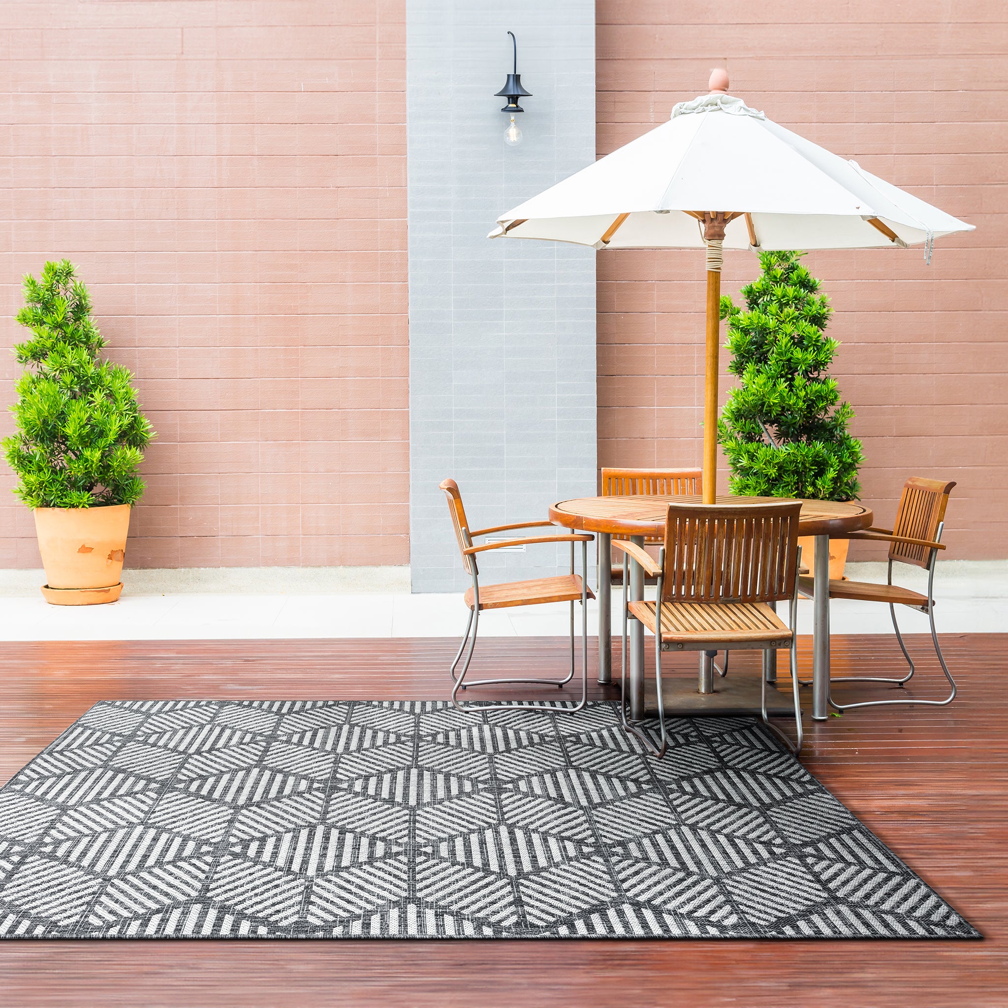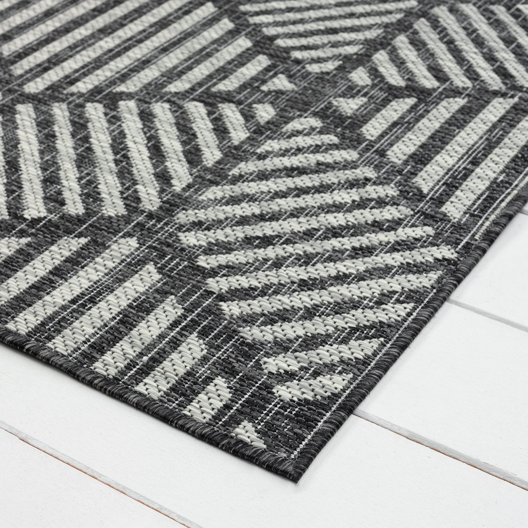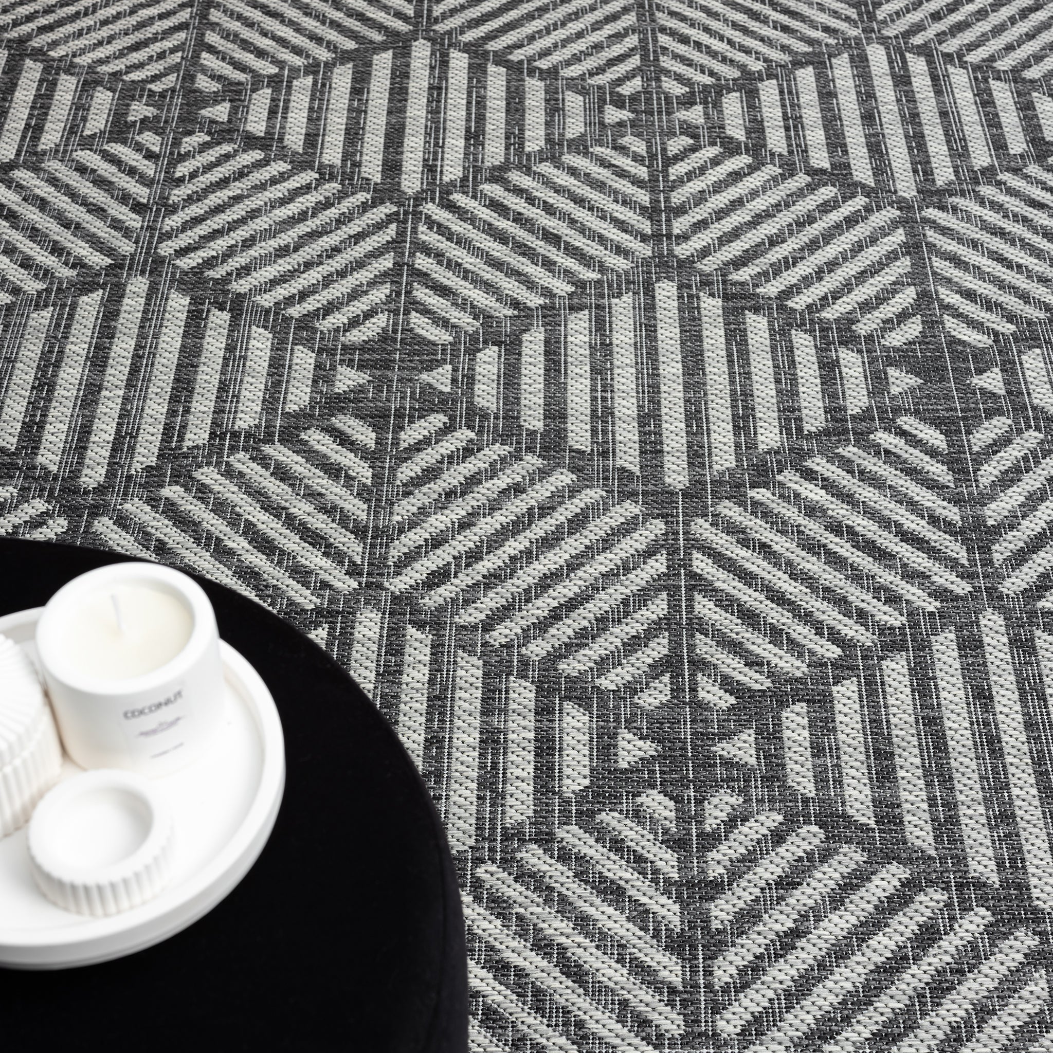 The Knox Geo Rug brings a bold, structured look to both indoor and outdoor spaces, with its geometric pattern and cool monochrome palette. It’s a durable, low-maintenance option that suits busy homes and covered outdoor areas.