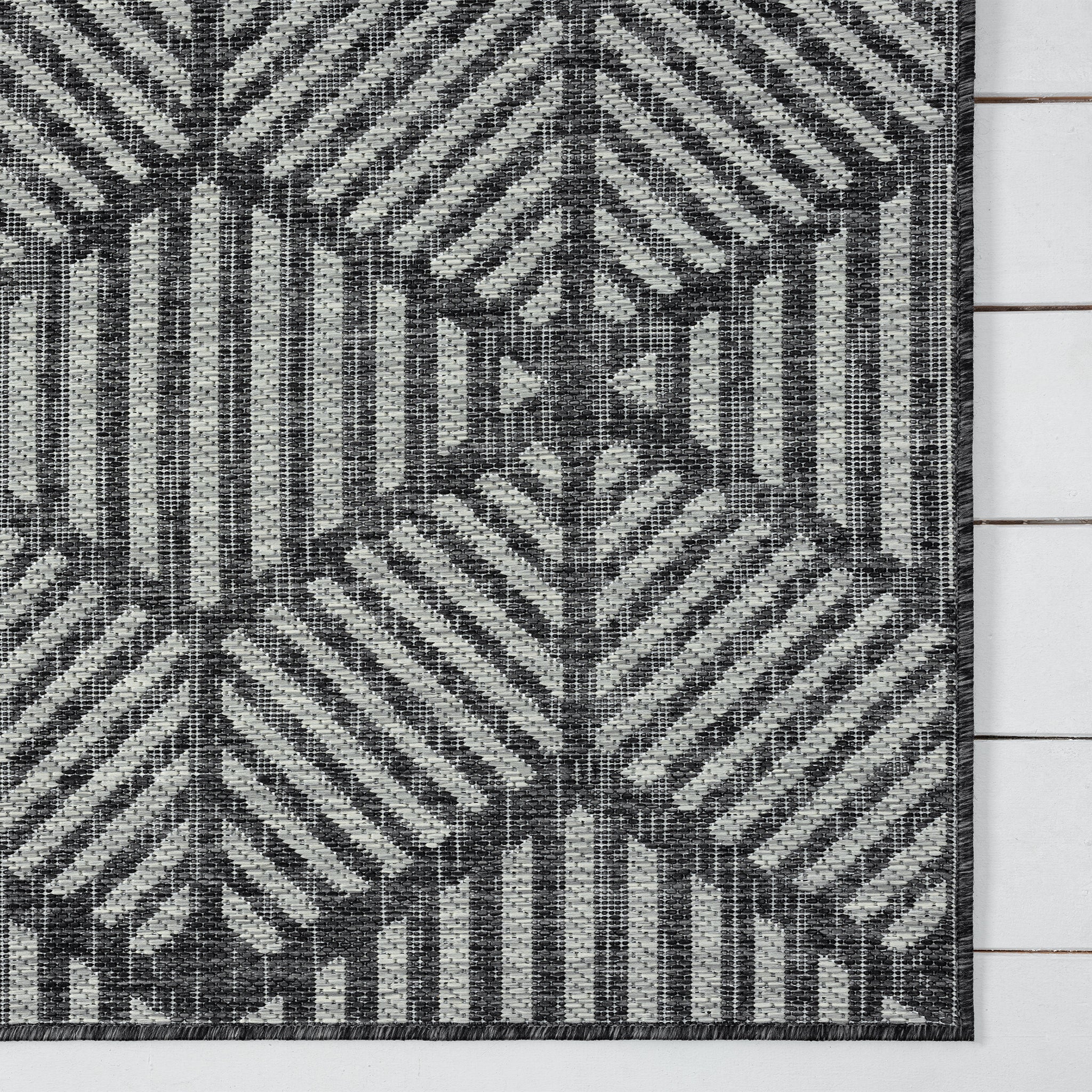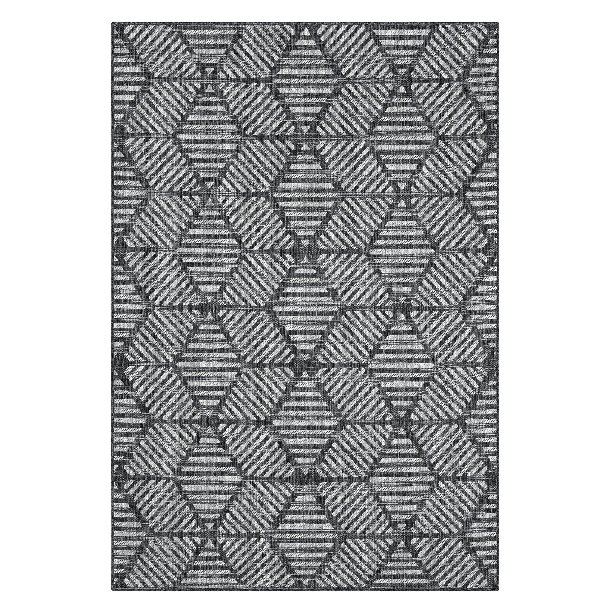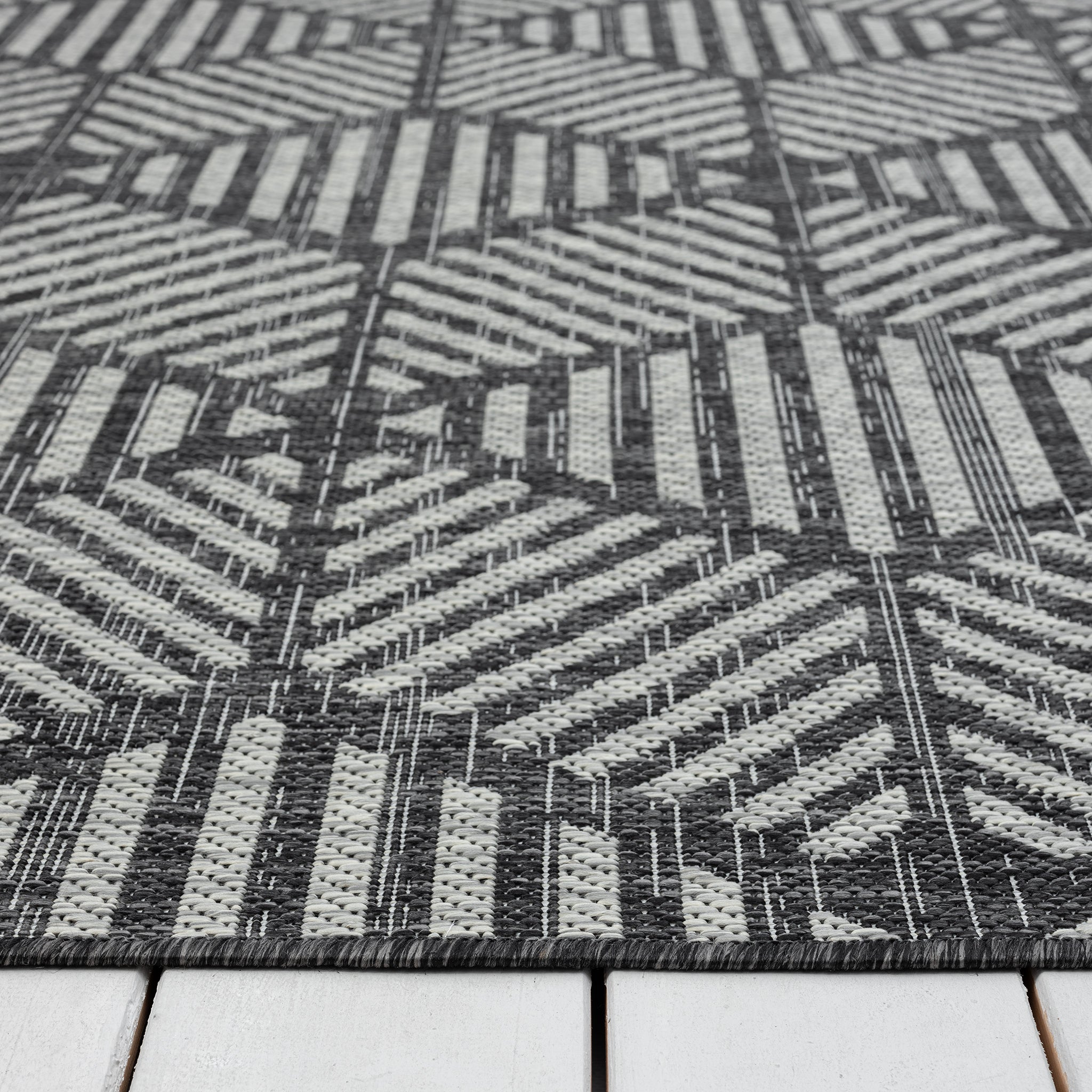 The Knox Geo Rug brings a bold, structured look to both indoor and outdoor spaces, with its geometric pattern and cool monochrome palette. It’s a durable, low-maintenance option that suits busy homes and covered outdoor areas.